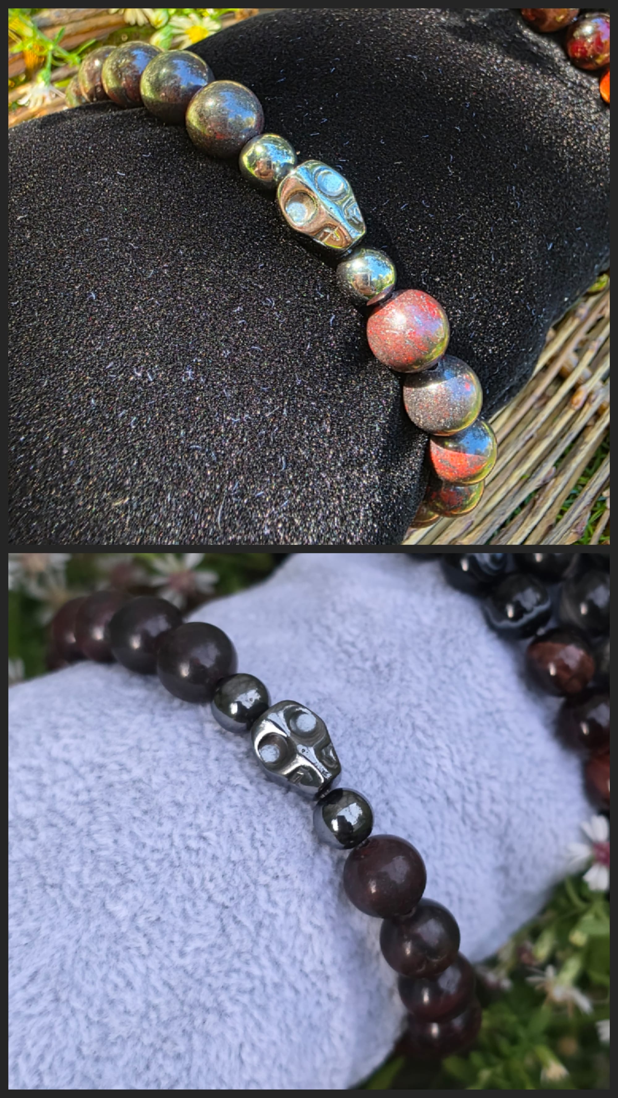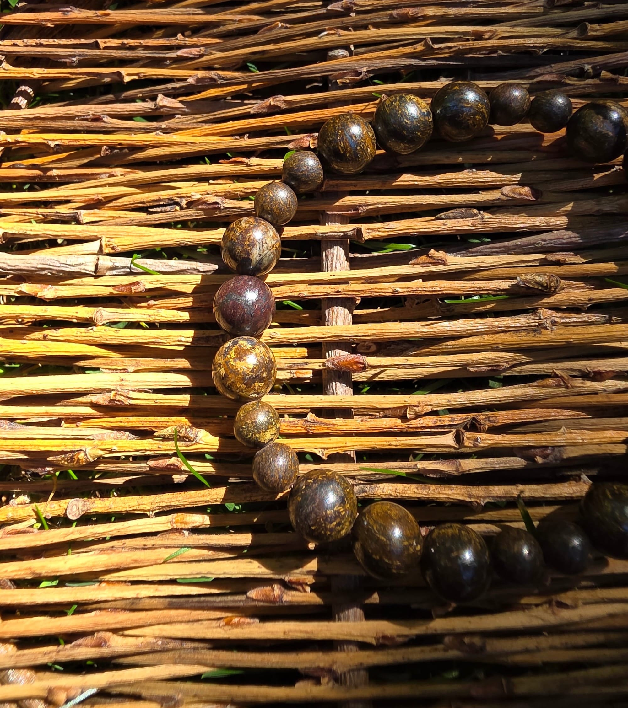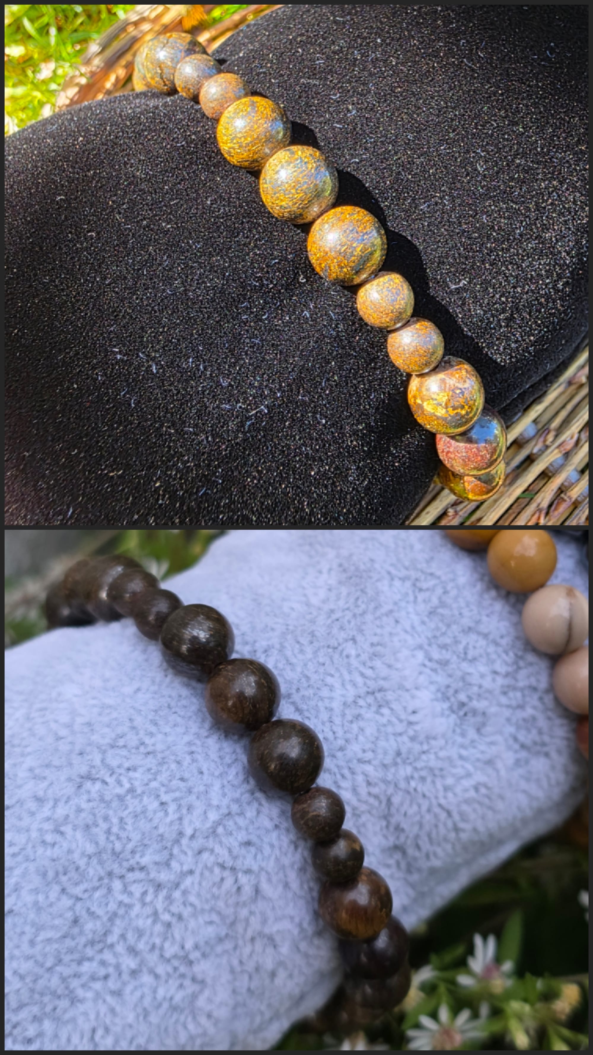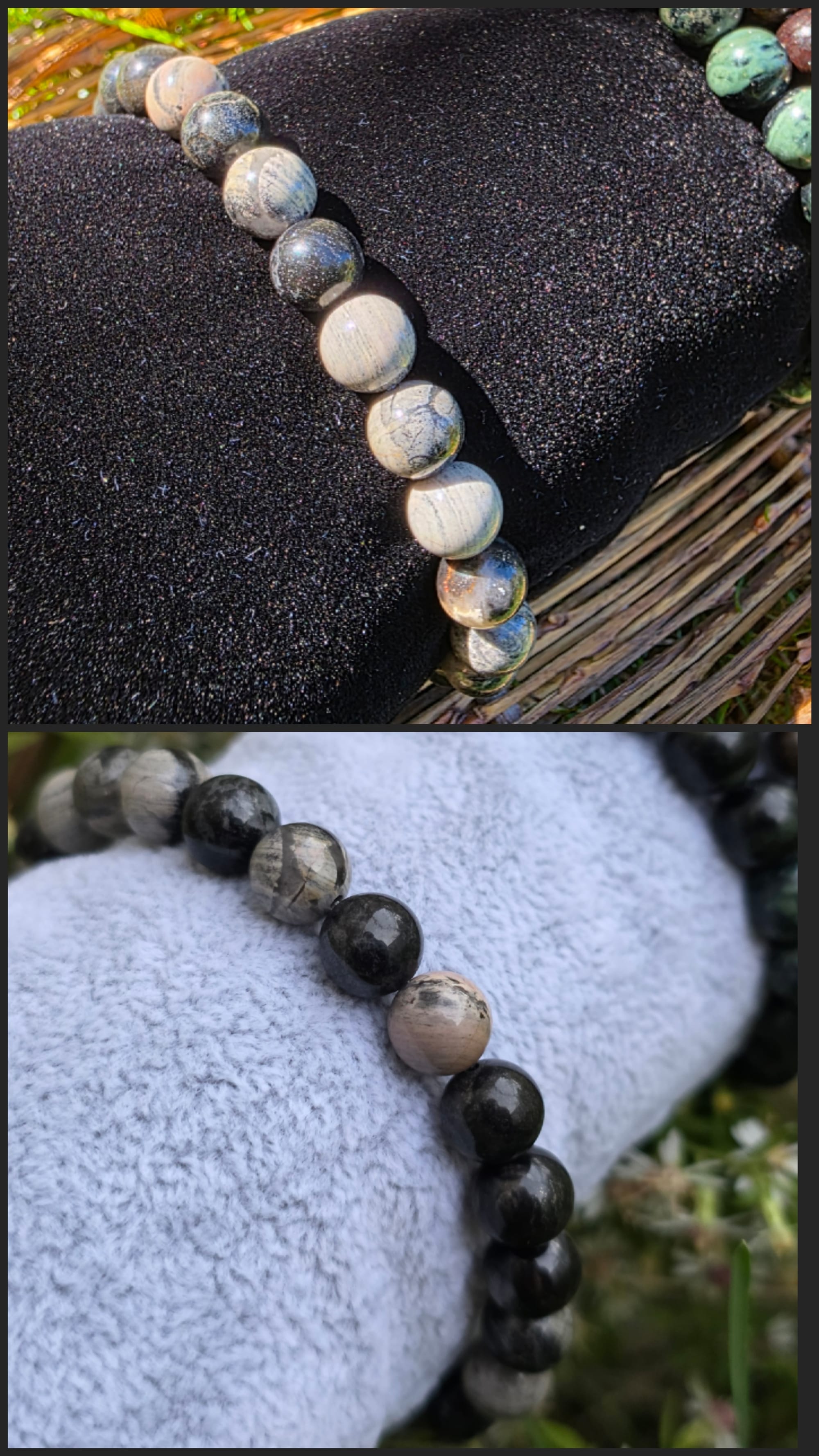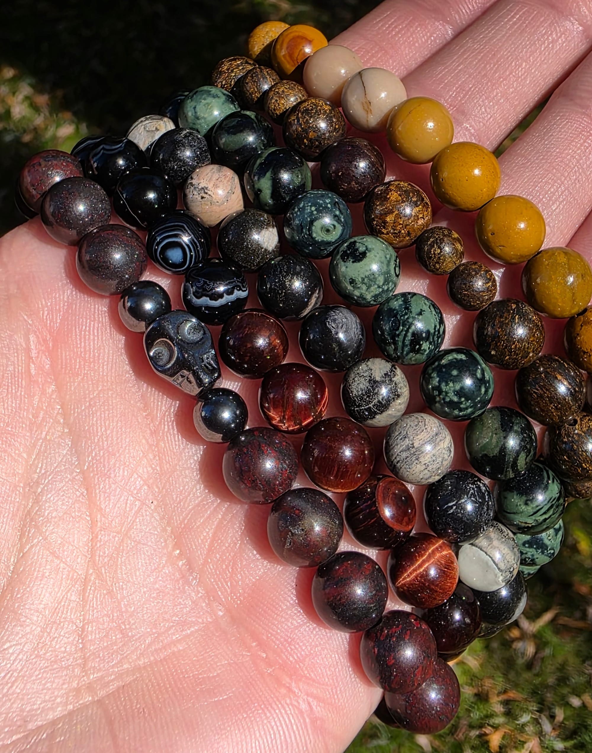 I won't be able to post these listings as ready-to-ship for in my Etsy shop for a minute (I'm working on a few time-consuming charity pieces about which I feel very passionately) so I thought I'd make a little catalog on my blog in case there's any interest. Any of these bracelets can be customized to your preference. The majority of the beads used are 8mm. My favorite is the bronzite, personally. They have these gold highlights that glint like magic in the sun.