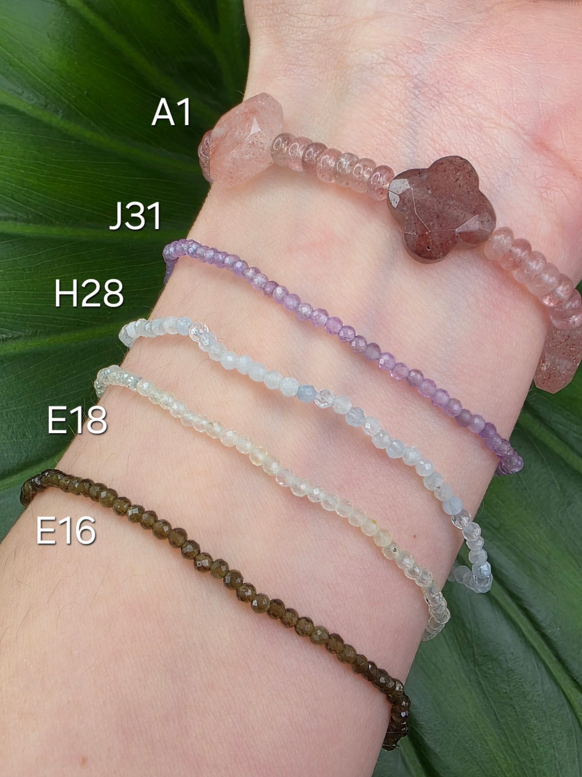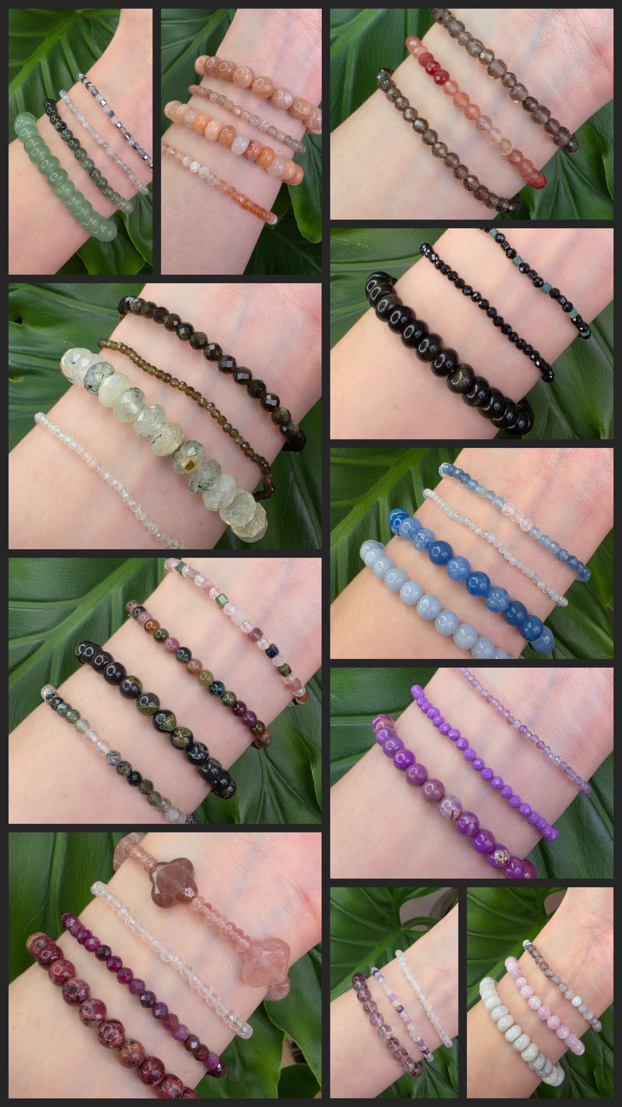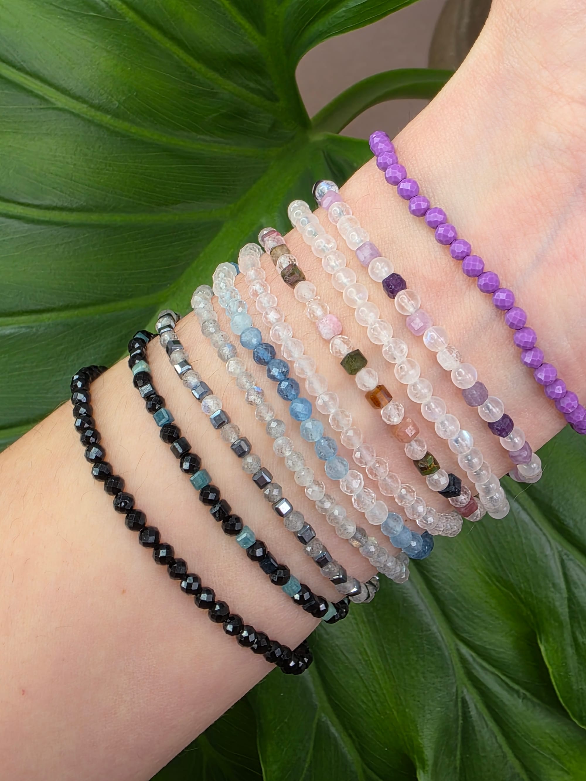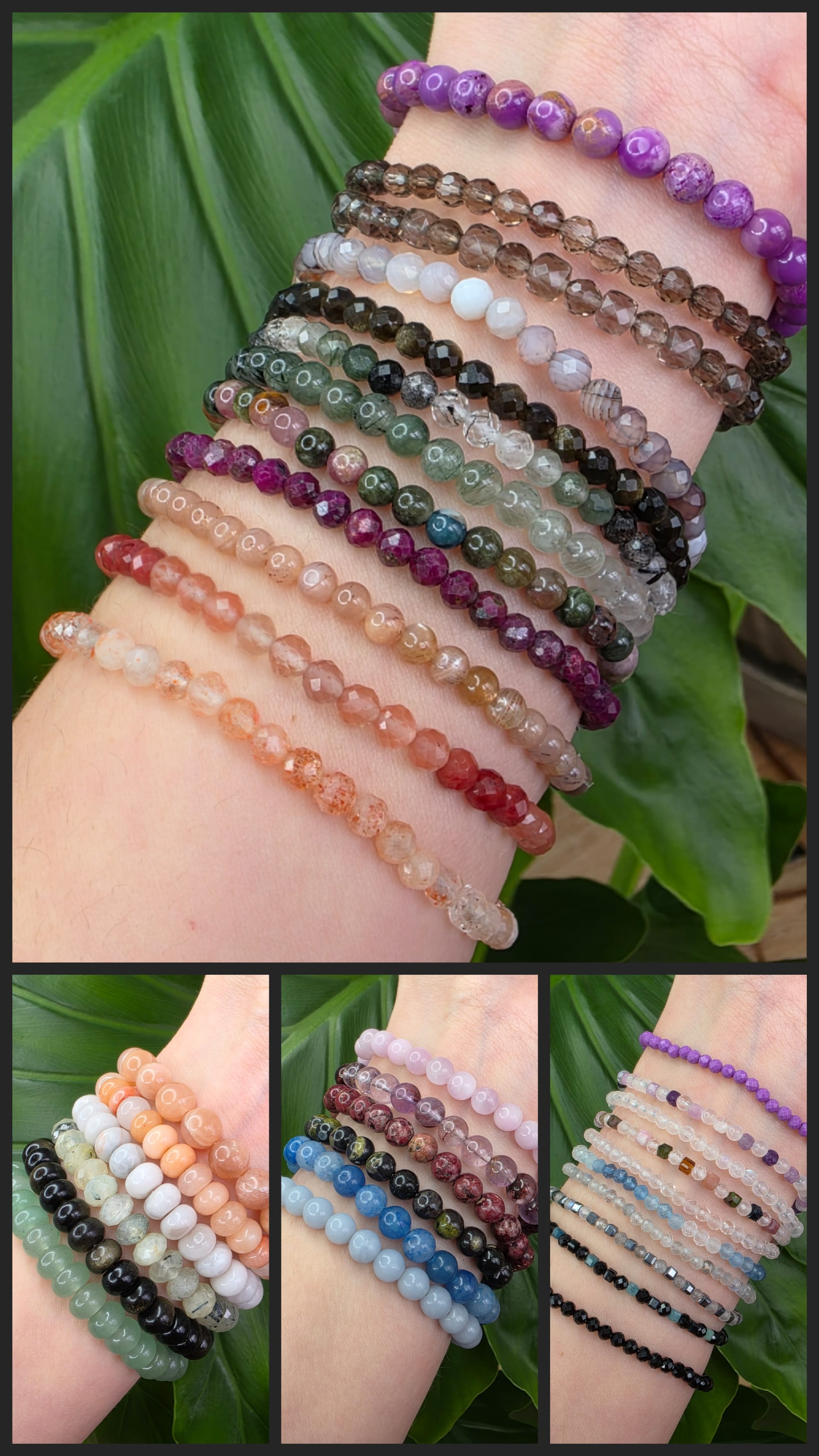 Bienvenue! Though I write this while the snow billows in abundance outside, spring is on the horizon! I'm incredibly excited about this collection. I've arranged it into eleven mini color stories, then I've photographed the same bracelets organized by size for comparisons, and I've finished with some additional styling ideas. The especially high-quality stones have been noted (A-AAA), but the ones not marked as such doesn't necessarily denote a lower quality, just that that particular supplier doesn't list the grade. Any ombré bracelets can be made in a random color pattern if you'd prefer (check out the pink aventurine or 4mm rainbow tourmaline for examples of how that looks). As everything is made to order, all bracelets are open to customization.