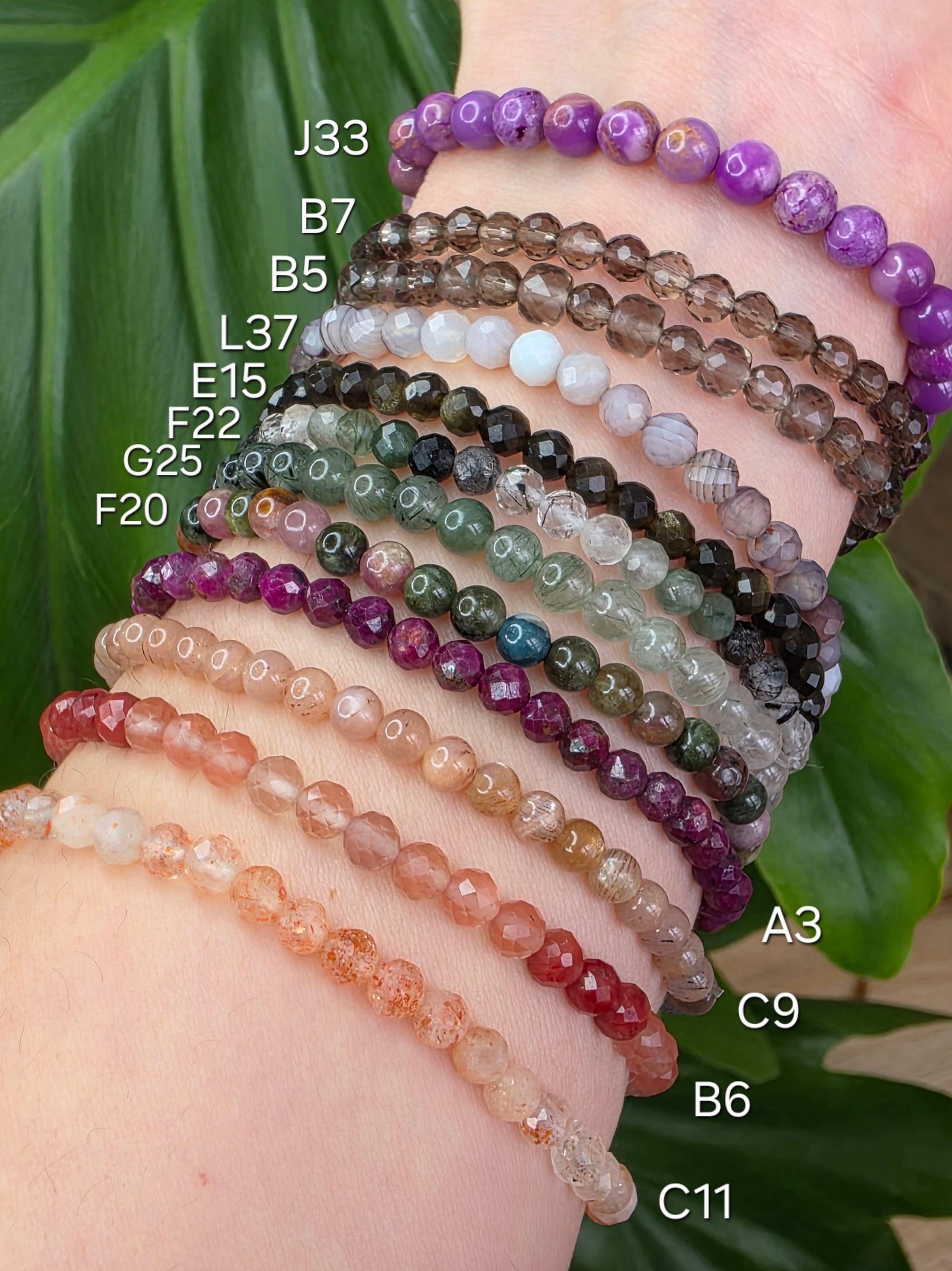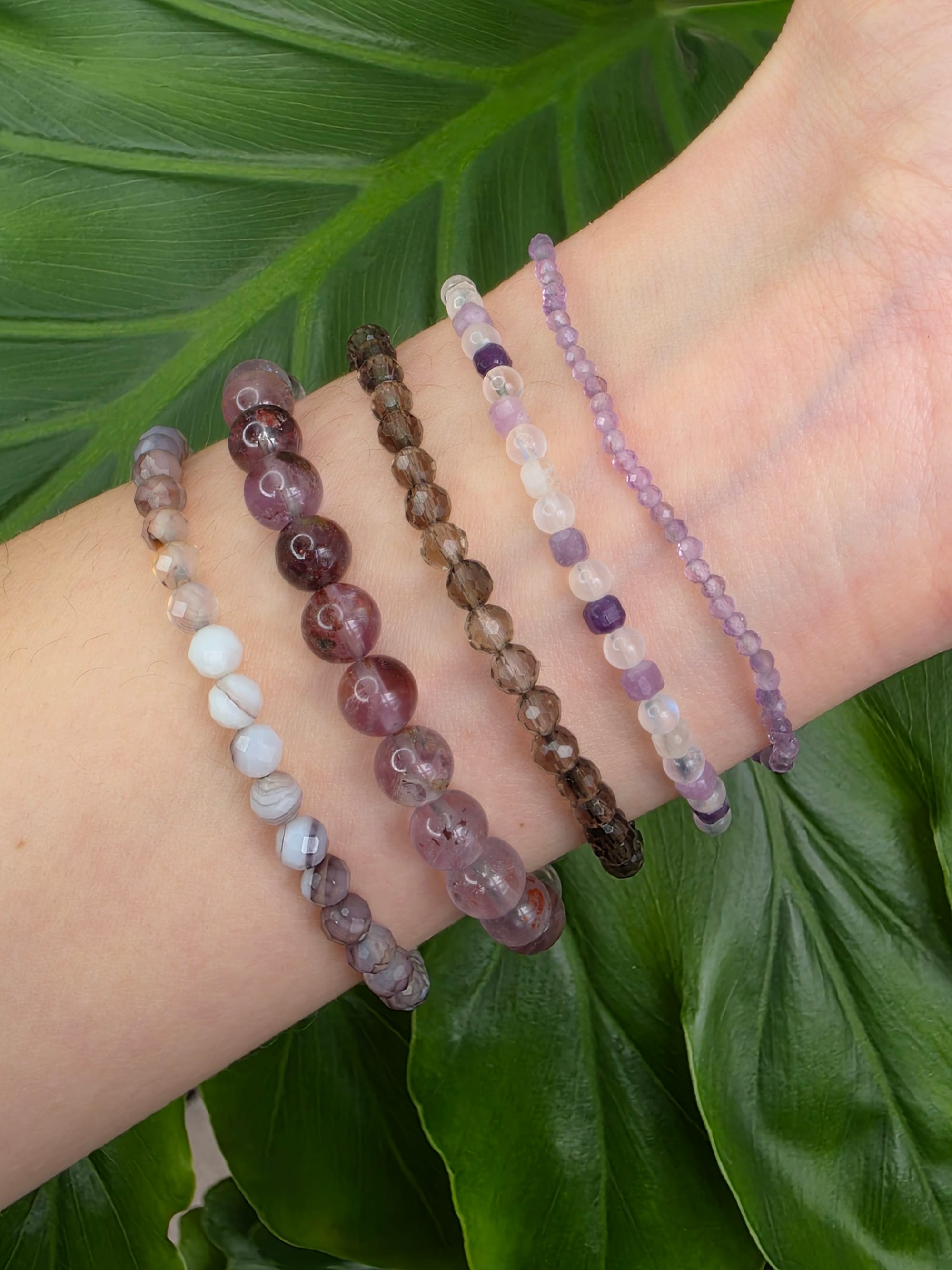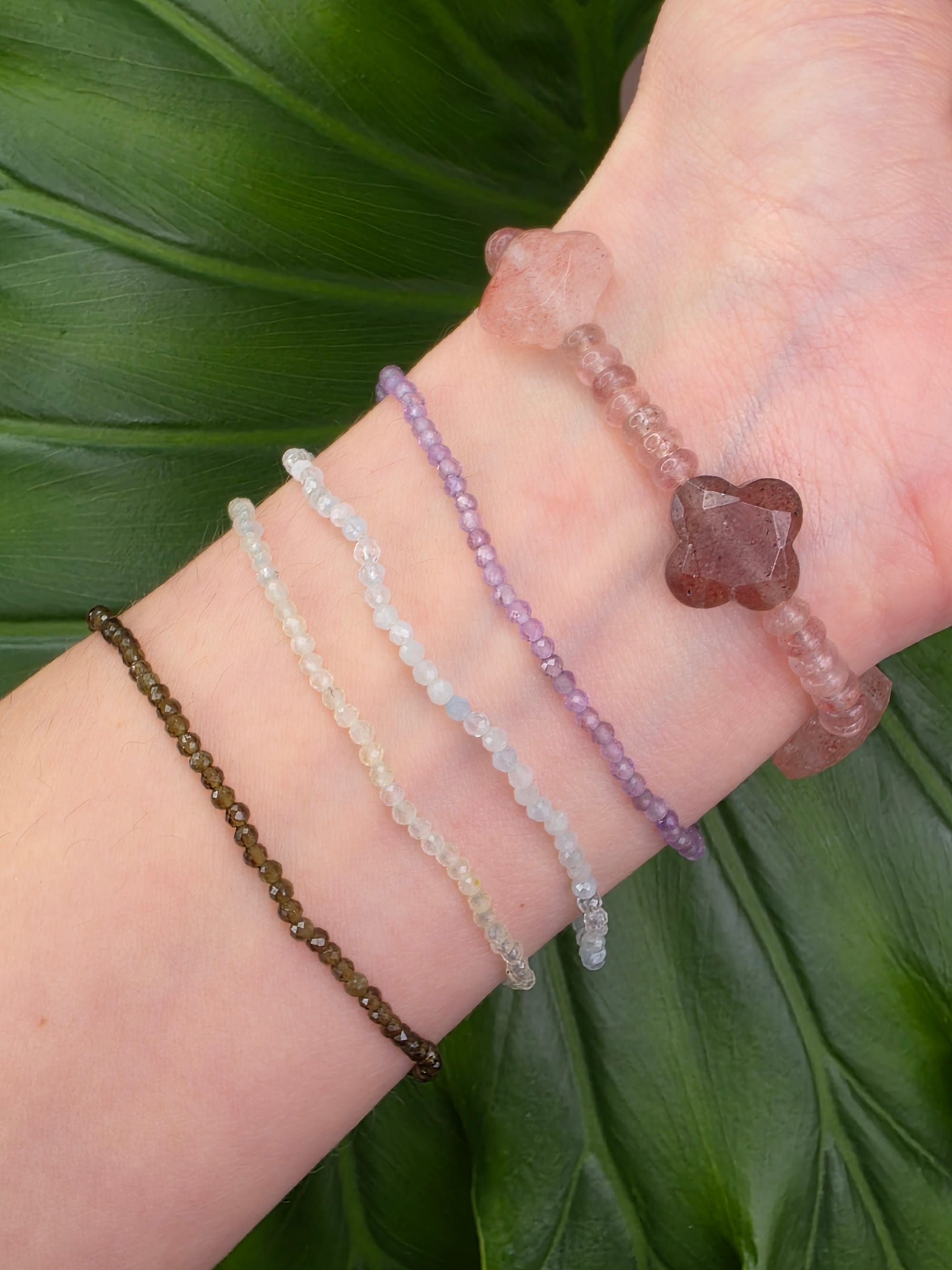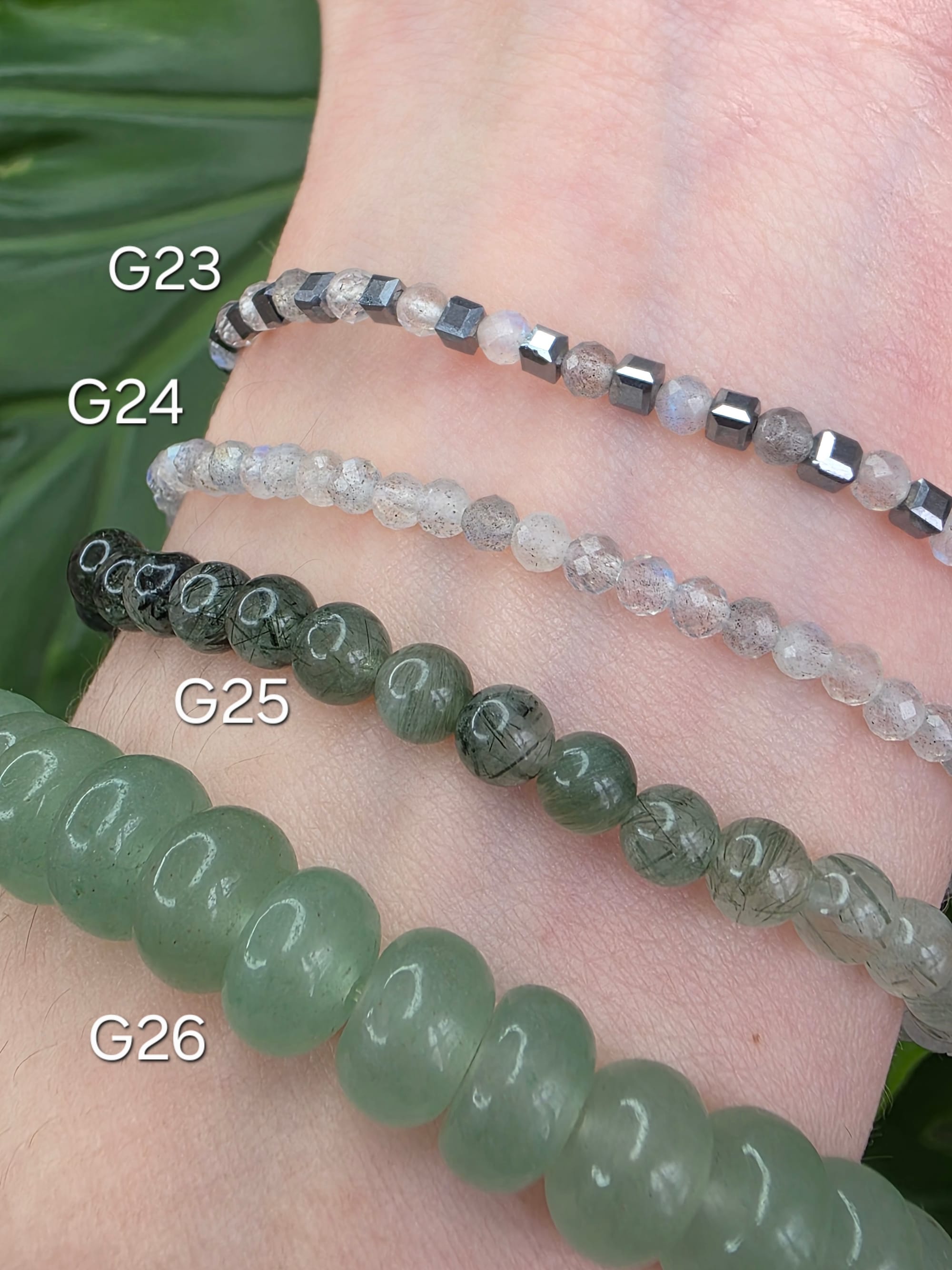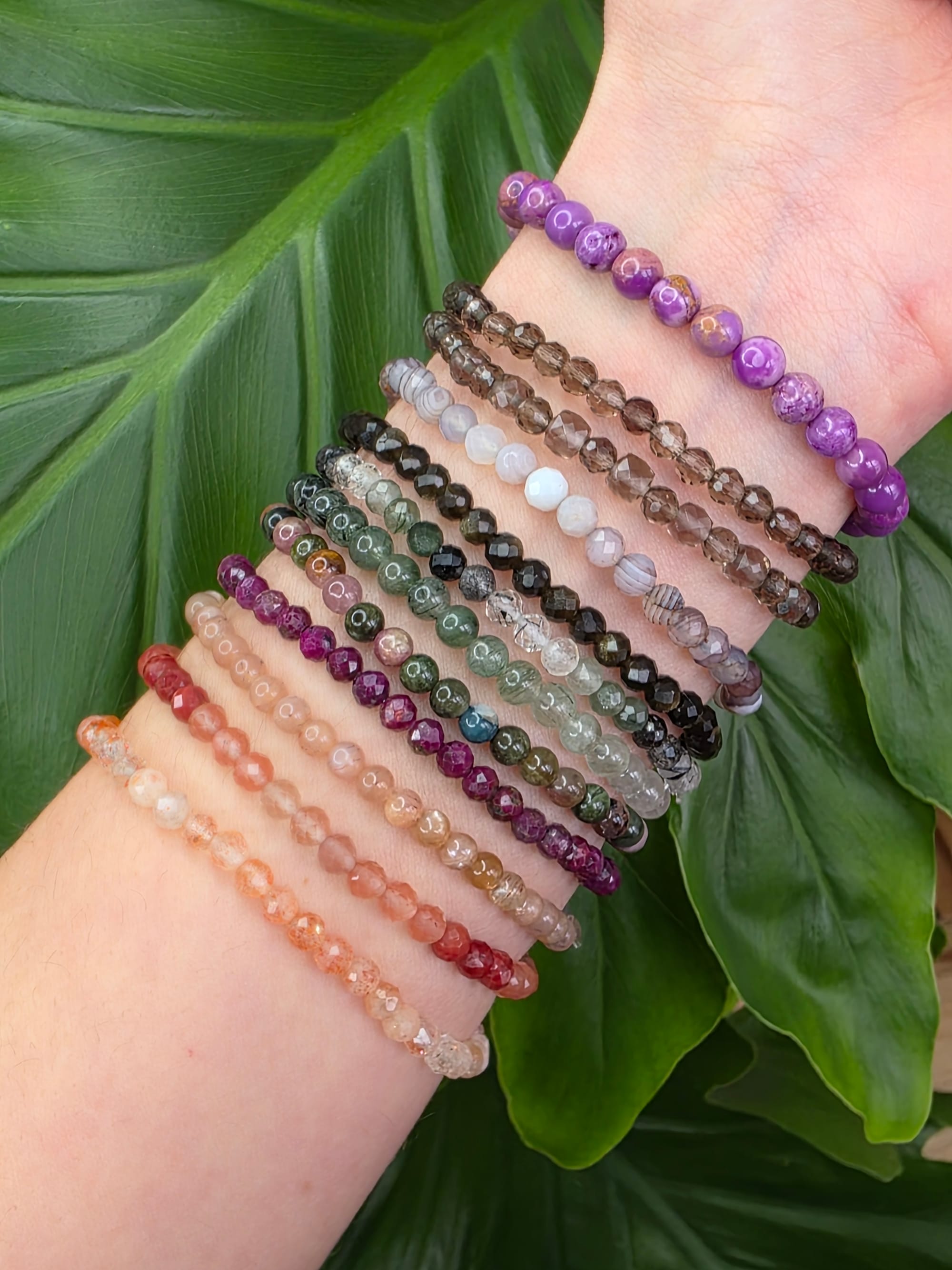 Bienvenue! Though I write this while the snow billows in abundance outside, spring is on the horizon! I'm incredibly excited about this collection. I've arranged it into eleven mini color stories, then I've photographed the same bracelets organized by size for comparisons, and I've finished with some additional styling ideas. The especially high-quality stones have been noted (A-AAA), but the ones not marked as such doesn't necessarily denote a lower quality, just that that particular supplier doesn't list the grade. Any ombré bracelets can be made in a random color pattern if you'd prefer (check out the pink aventurine or 4mm rainbow tourmaline for examples of how that looks). As everything is made to order, all bracelets are open to customization.