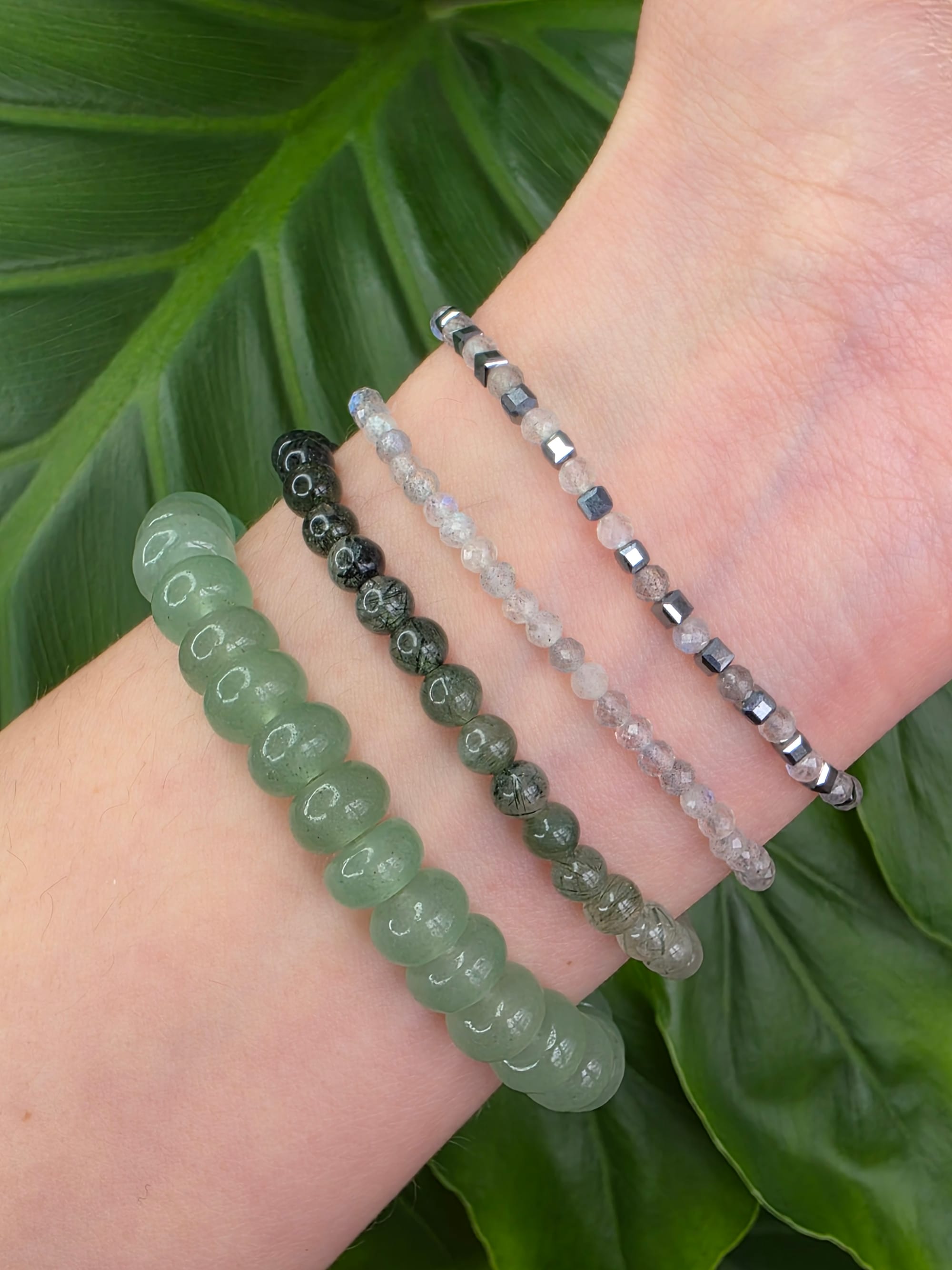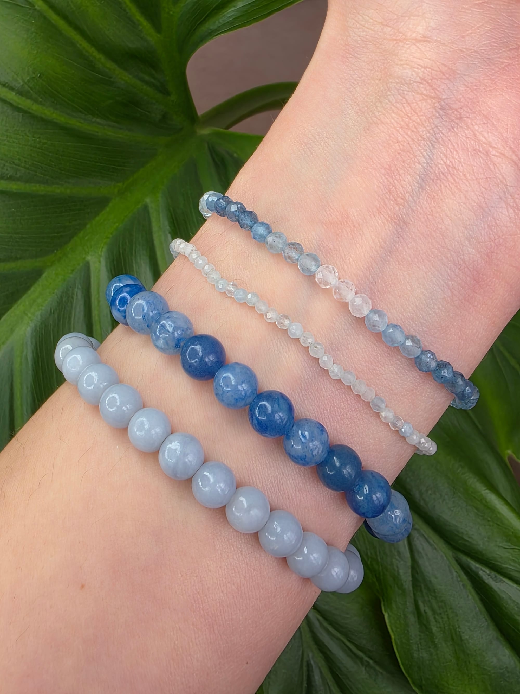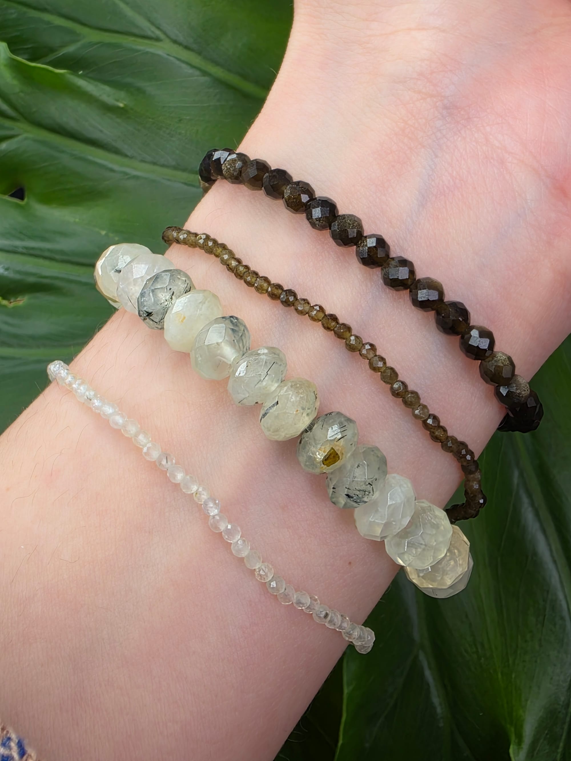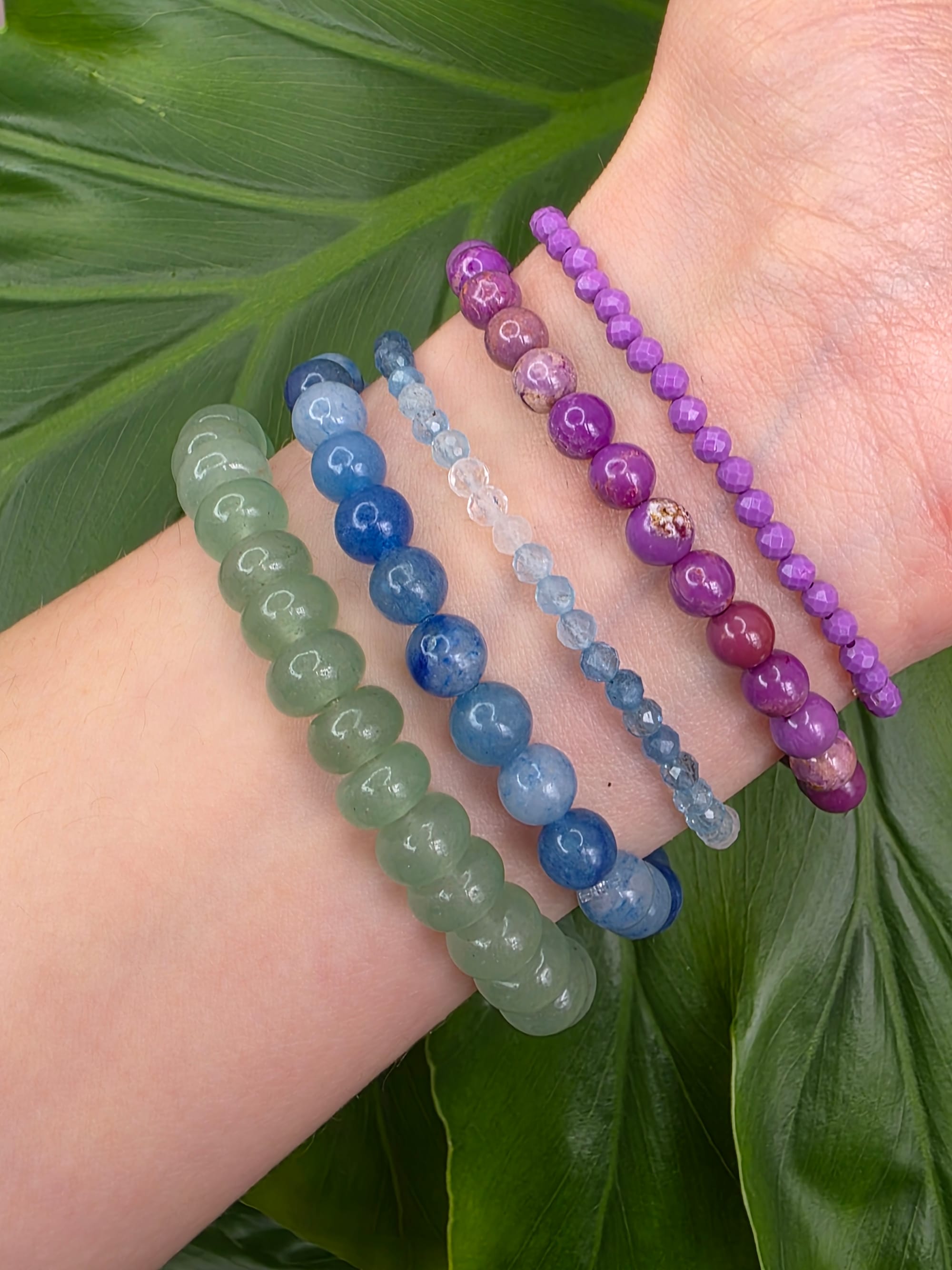Bienvenue! Though I write this while the snow billows in abundance outside, spring is on the horizon! I'm incredibly excited about this collection. I've arranged it into eleven mini color stories, then I've photographed the same bracelets organized by size for comparisons, and I've finished with some additional styling ideas. The especially high-quality stones have been noted (A-AAA), but the ones not marked as such doesn't necessarily denote a lower quality, just that that particular supplier doesn't list the grade. Any ombré bracelets can be made in a random color pattern if you'd prefer (check out the pink aventurine or 4mm rainbow tourmaline for examples of how that looks). As everything is made to order, all bracelets are open to customization.
