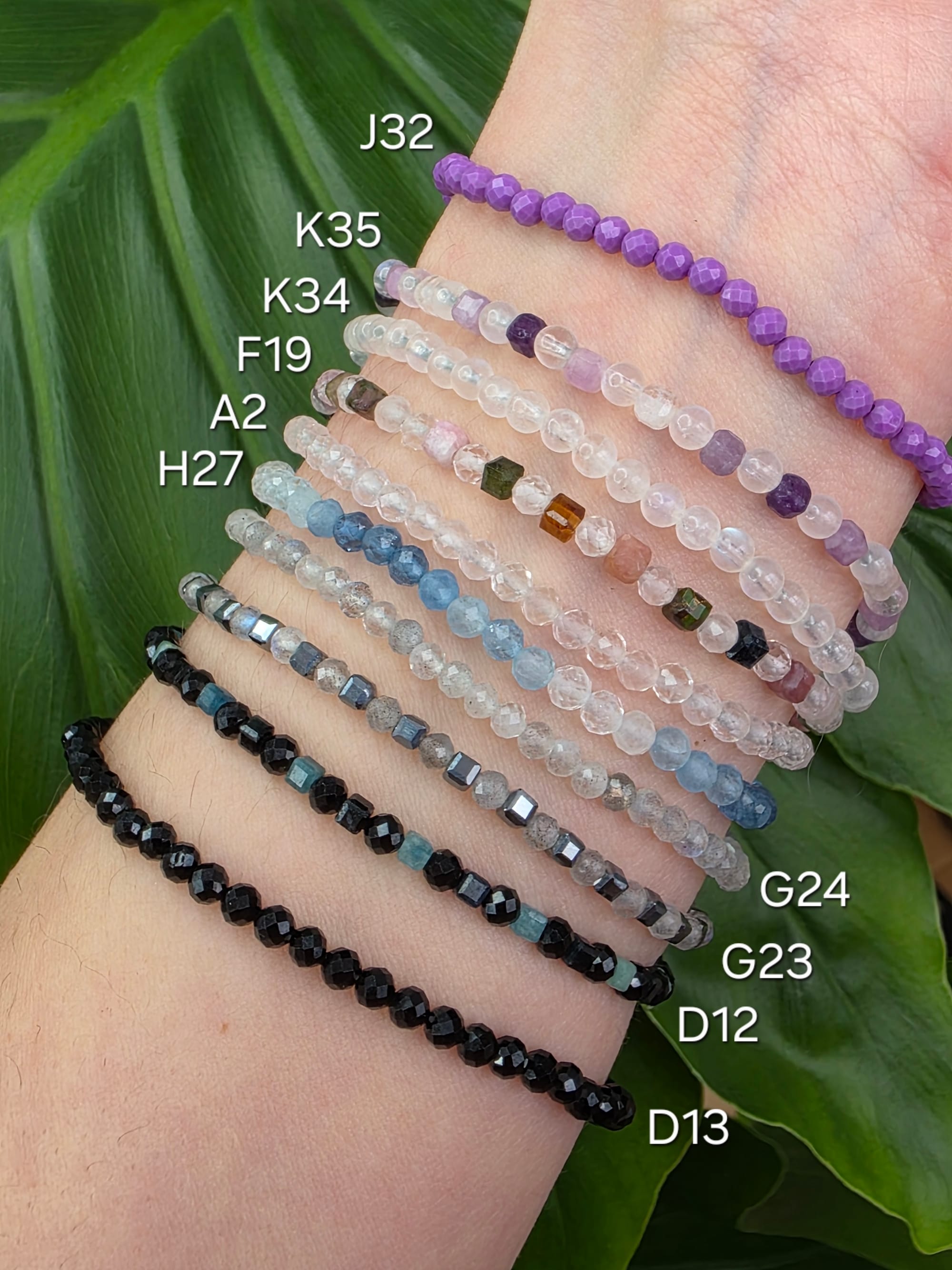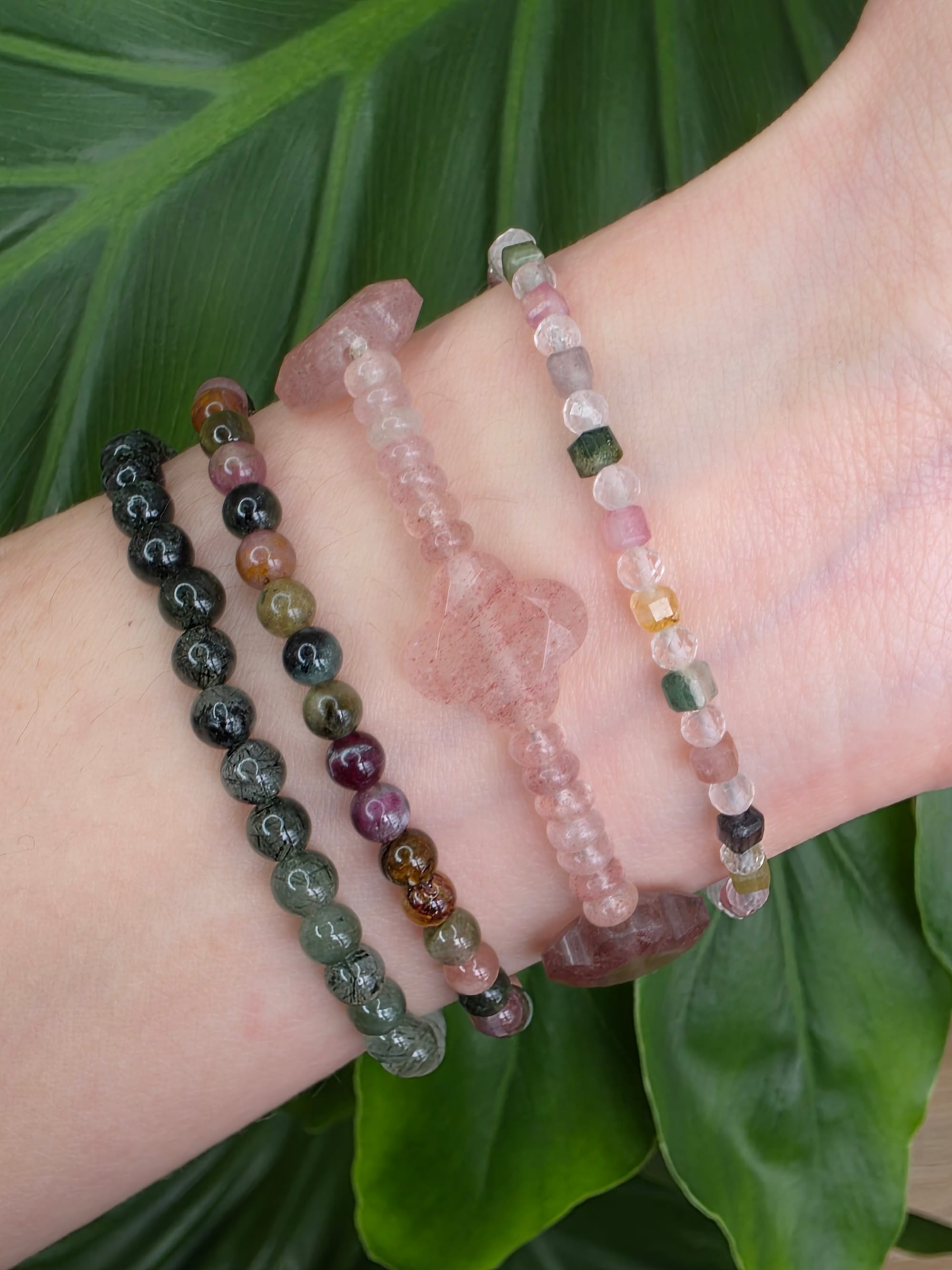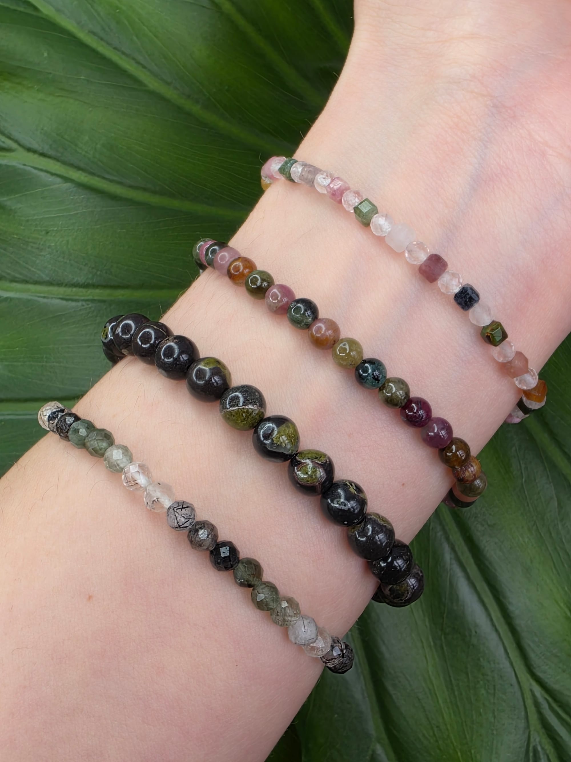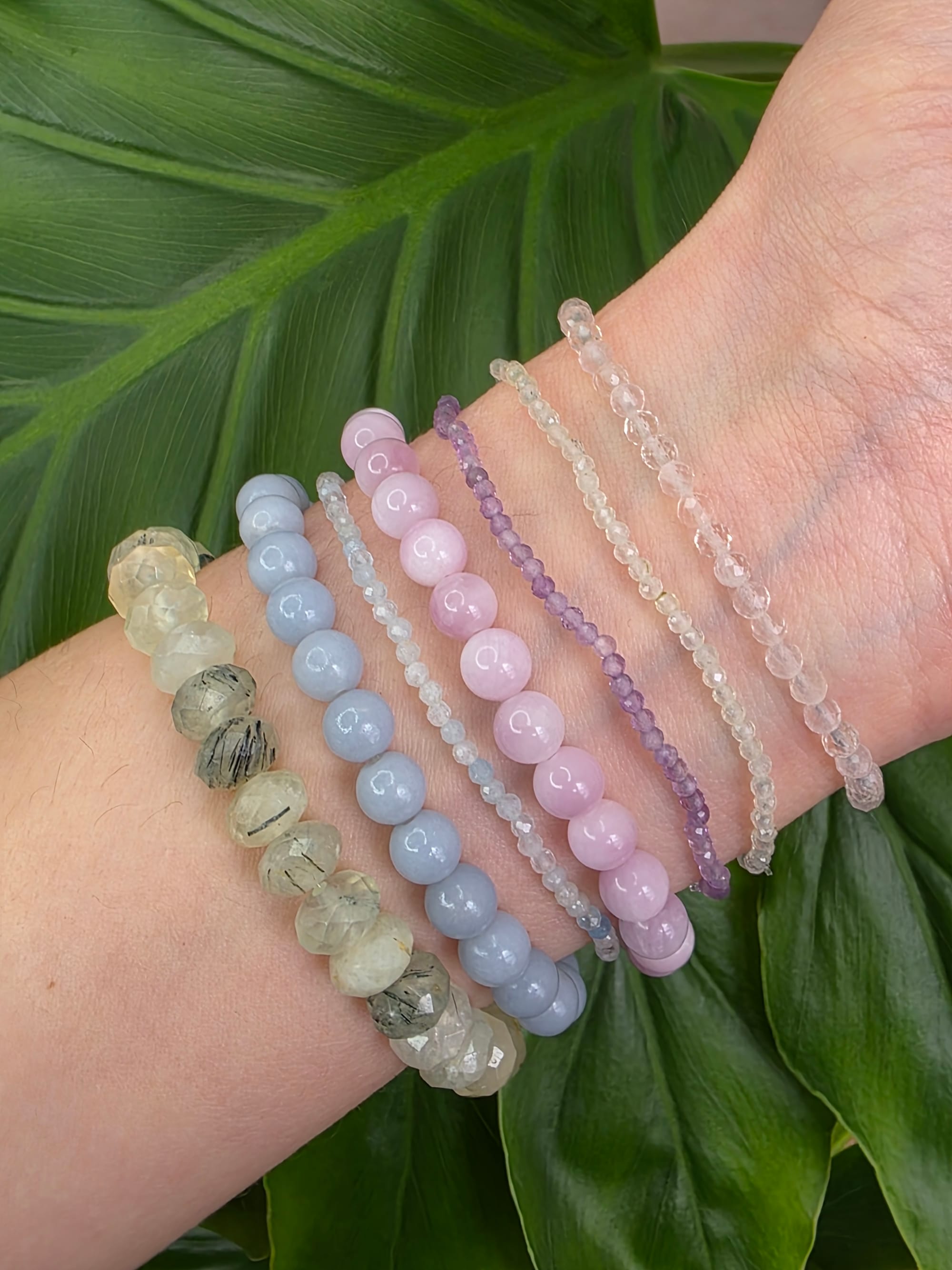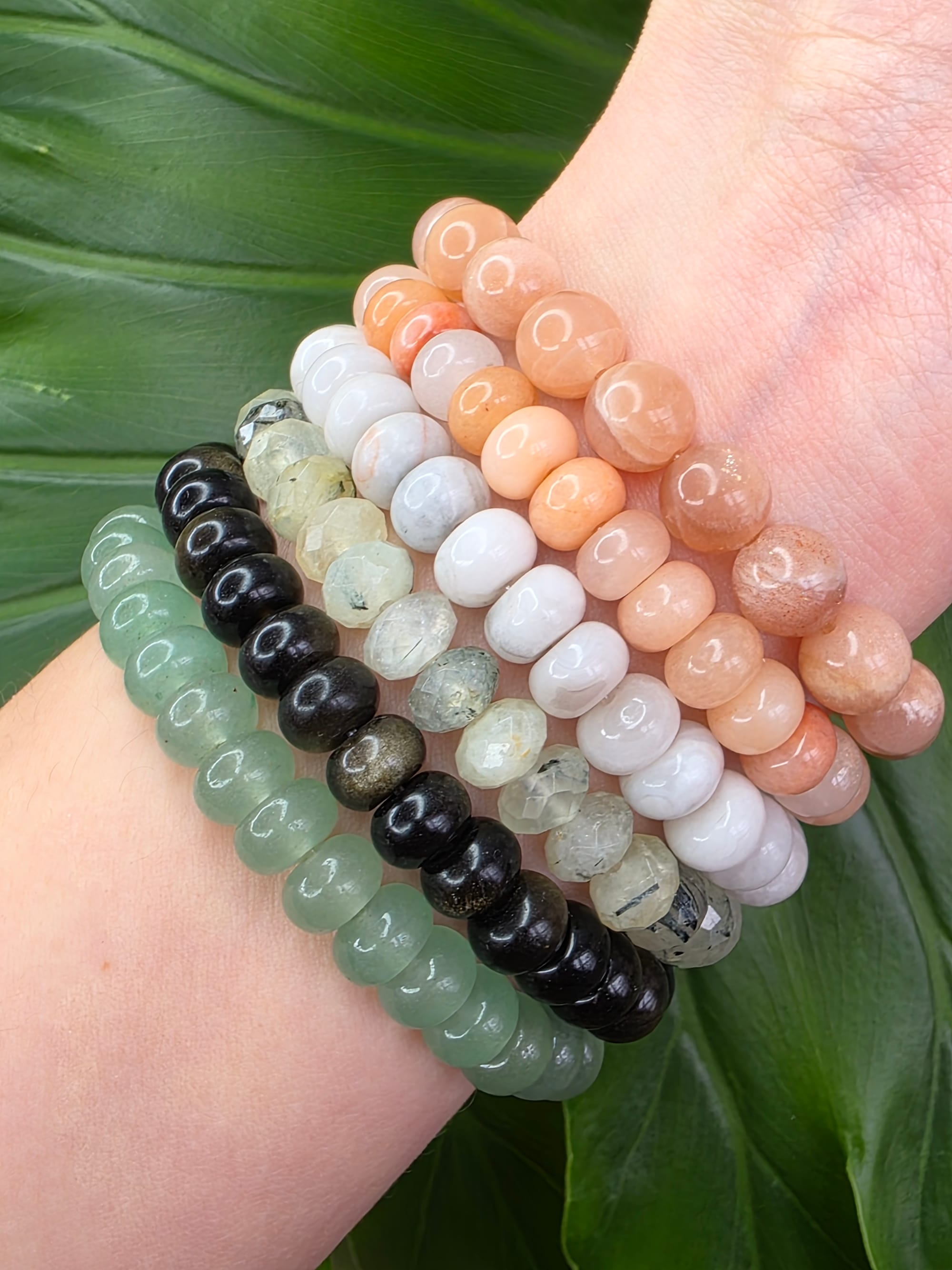Bienvenue! Though I write this while the snow billows in abundance outside, spring is on the horizon! I'm incredibly excited about this collection. I've arranged it into eleven mini color stories, then I've photographed the same bracelets organized by size for comparisons, and I've finished with some additional styling ideas. The especially high-quality stones have been noted (A-AAA), but the ones not marked as such doesn't necessarily denote a lower quality, just that that particular supplier doesn't list the grade. Any ombré bracelets can be made in a random color pattern if you'd prefer (check out the pink aventurine or 4mm rainbow tourmaline for examples of how that looks). As everything is made to order, all bracelets are open to customization.