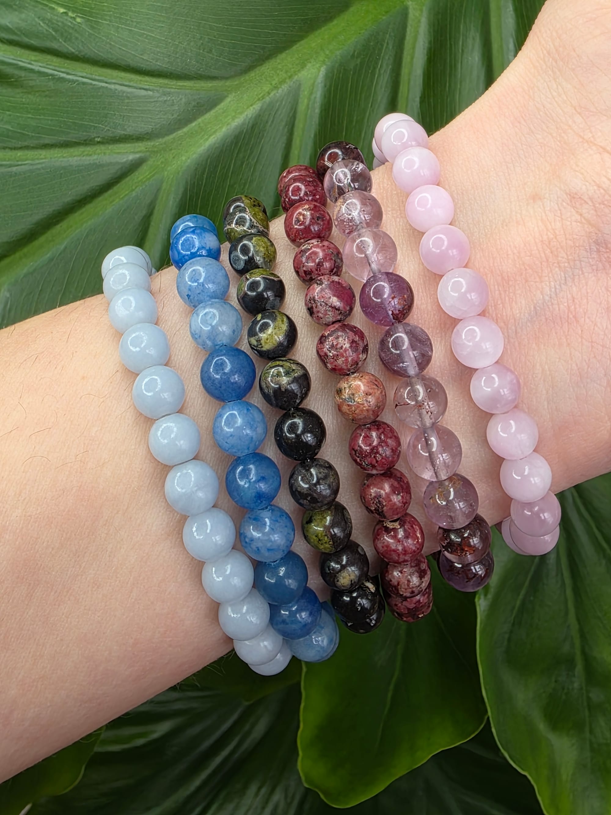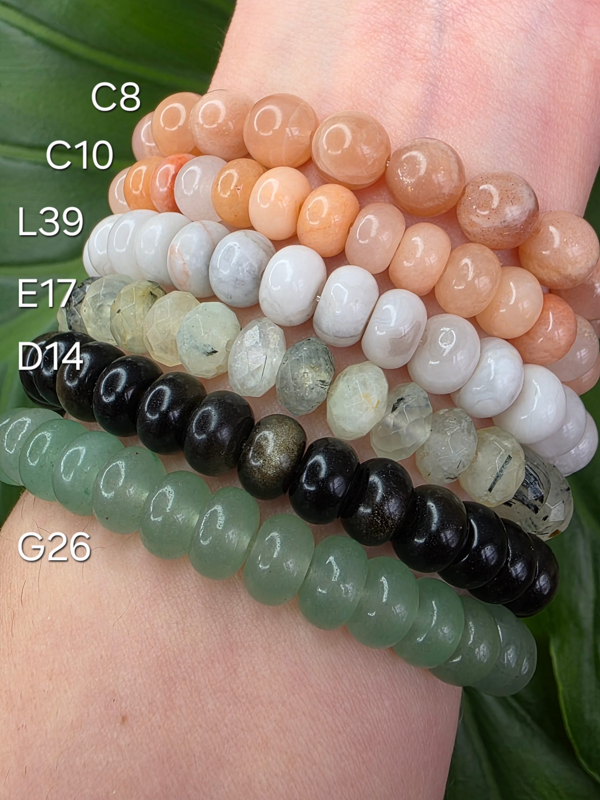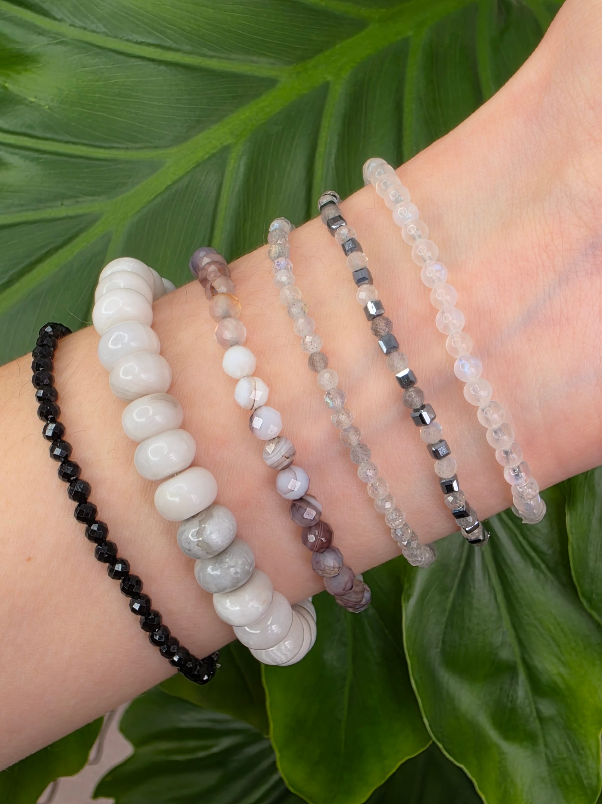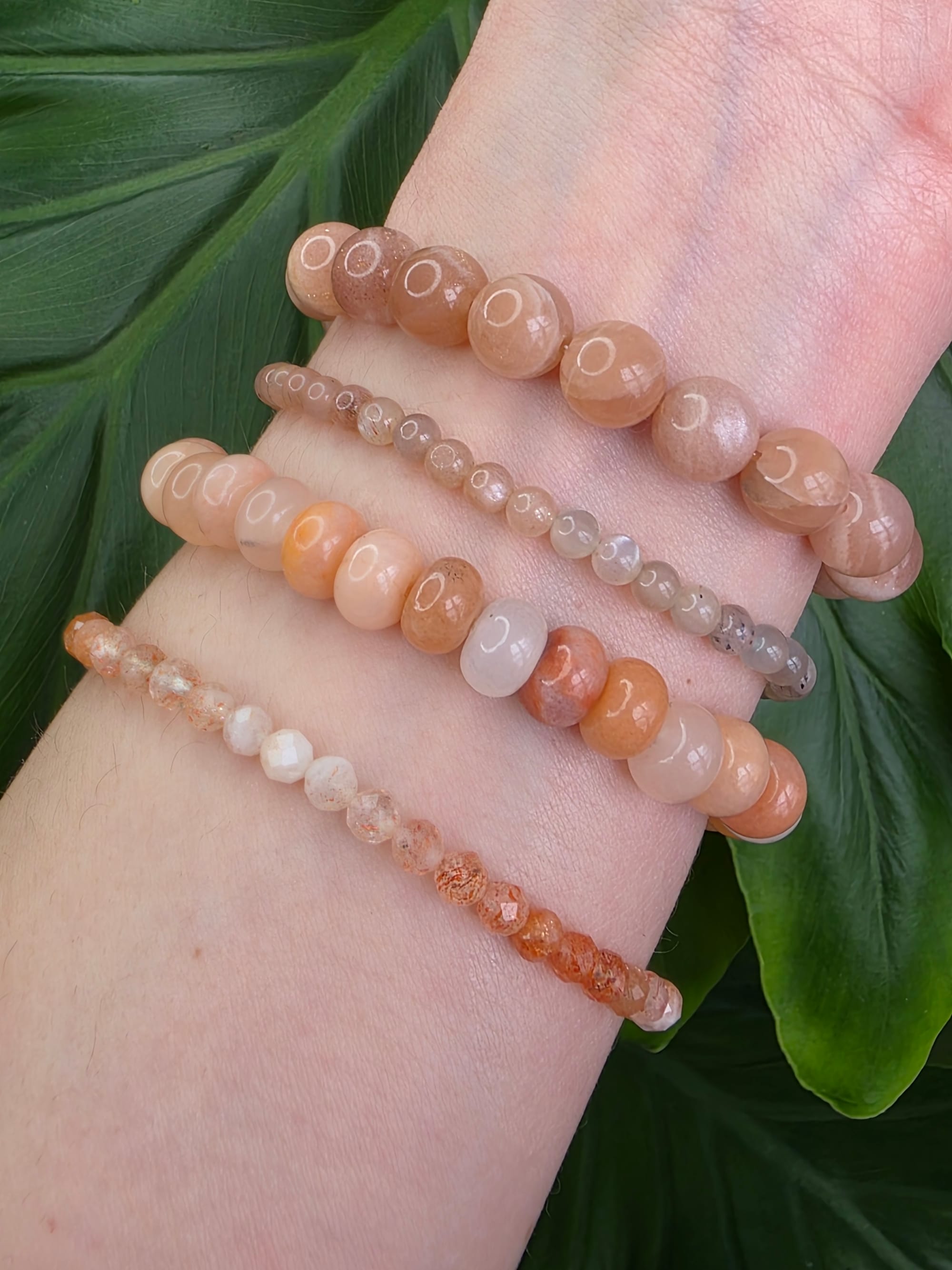 Bienvenue! Though I write this while the snow billows in abundance outside, spring is on the horizon! I'm incredibly excited about this collection. I've arranged it into eleven mini color stories, then I've photographed the same bracelets organized by size for comparisons, and I've finished with some additional styling ideas. The especially high-quality stones have been noted (A-AAA), but the ones not marked as such doesn't necessarily denote a lower quality, just that that particular supplier doesn't list the grade. Any ombré bracelets can be made in a random color pattern if you'd prefer (check out the pink aventurine or 4mm rainbow tourmaline for examples of how that looks). As everything is made to order, all bracelets are open to customization.