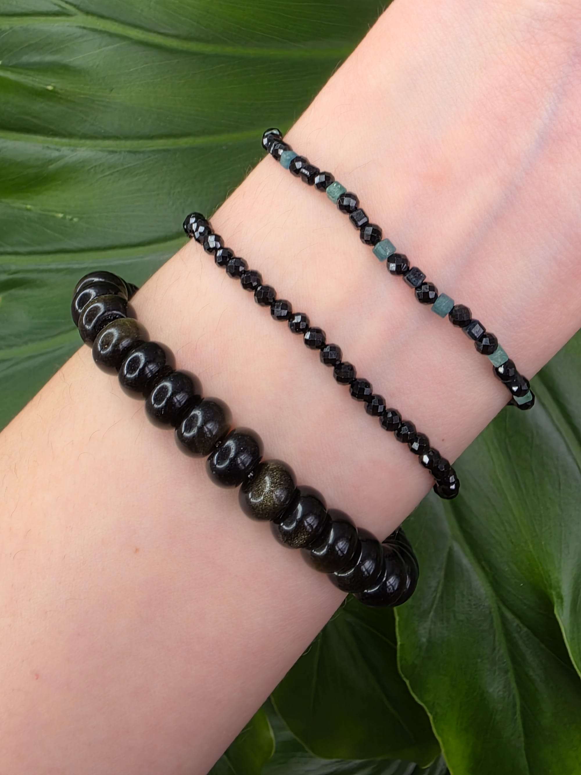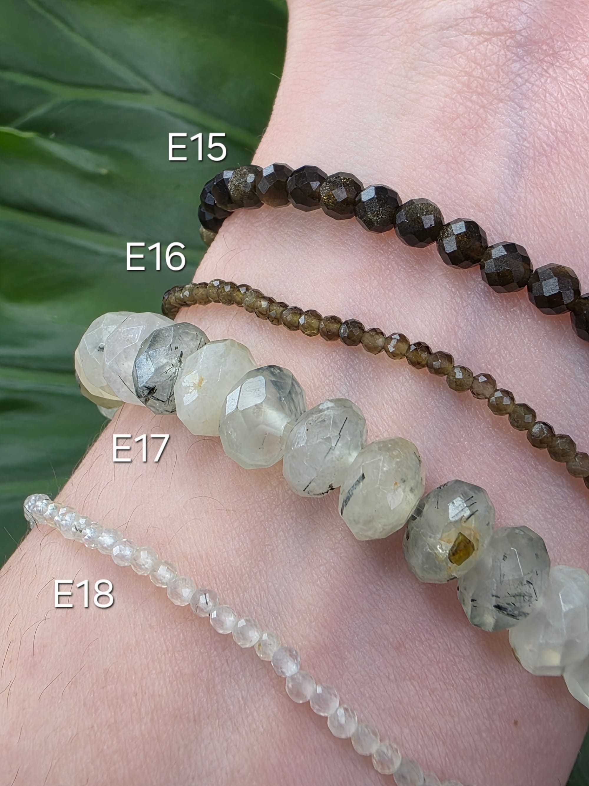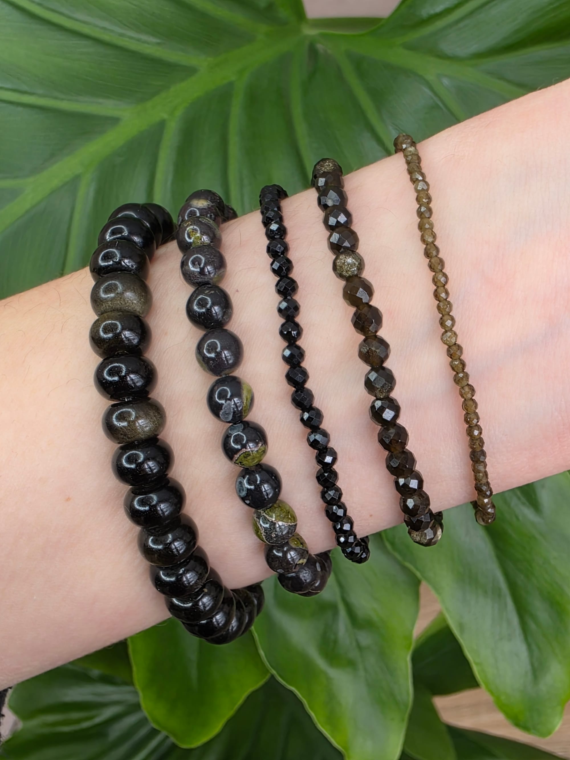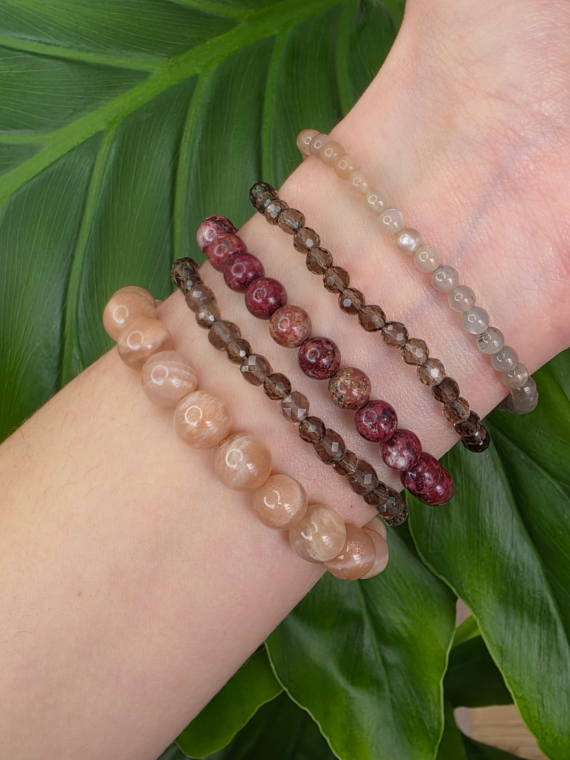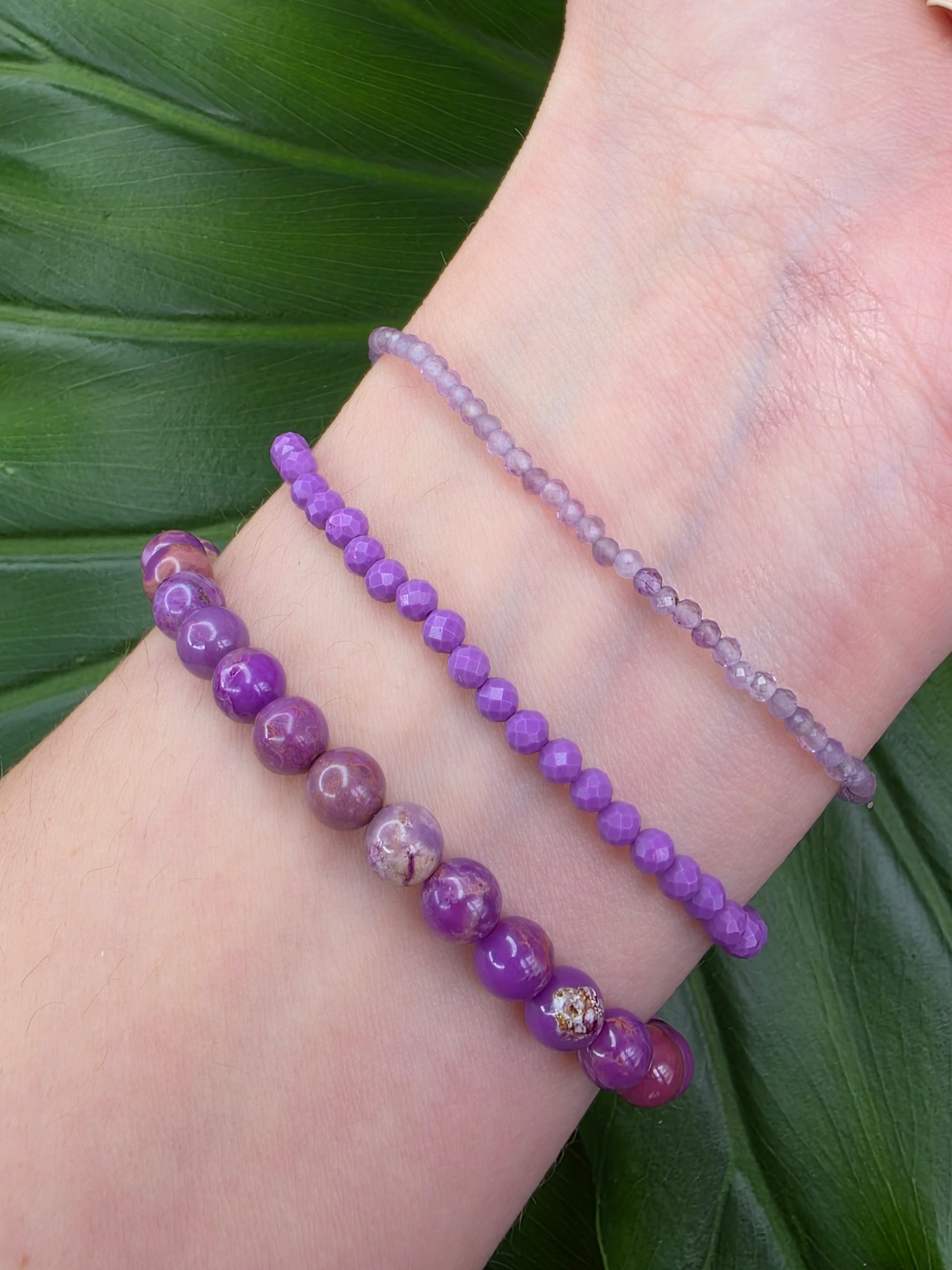 Bienvenue! Though I write this while the snow billows in abundance outside, spring is on the horizon! I'm incredibly excited about this collection. I've arranged it into eleven mini color stories, then I've photographed the same bracelets organized by size for comparisons, and I've finished with some additional styling ideas. The especially high-quality stones have been noted (A-AAA), but the ones not marked as such doesn't necessarily denote a lower quality, just that that particular supplier doesn't list the grade. Any ombré bracelets can be made in a random color pattern if you'd prefer (check out the pink aventurine or 4mm rainbow tourmaline for examples of how that looks). As everything is made to order, all bracelets are open to customization.