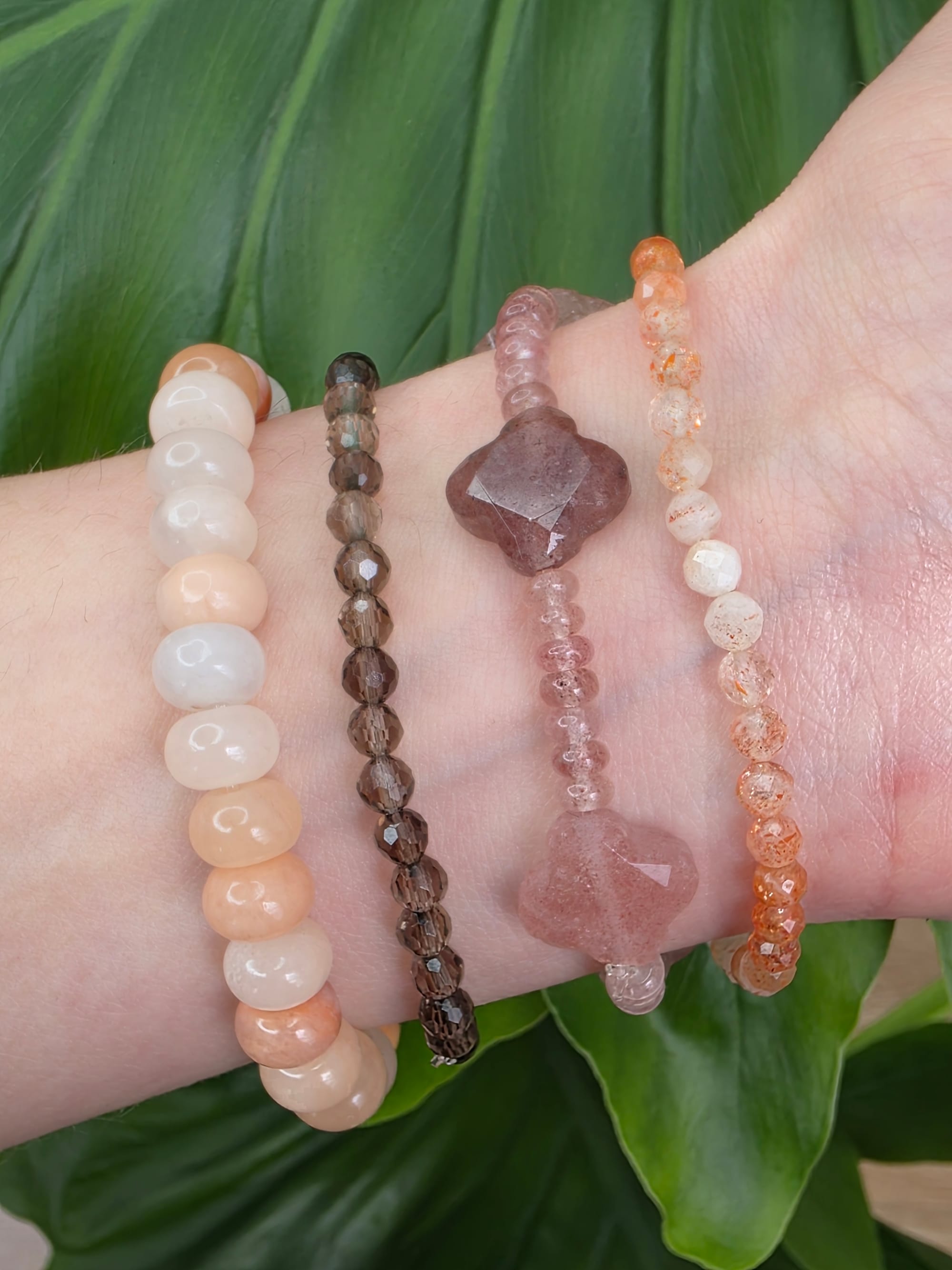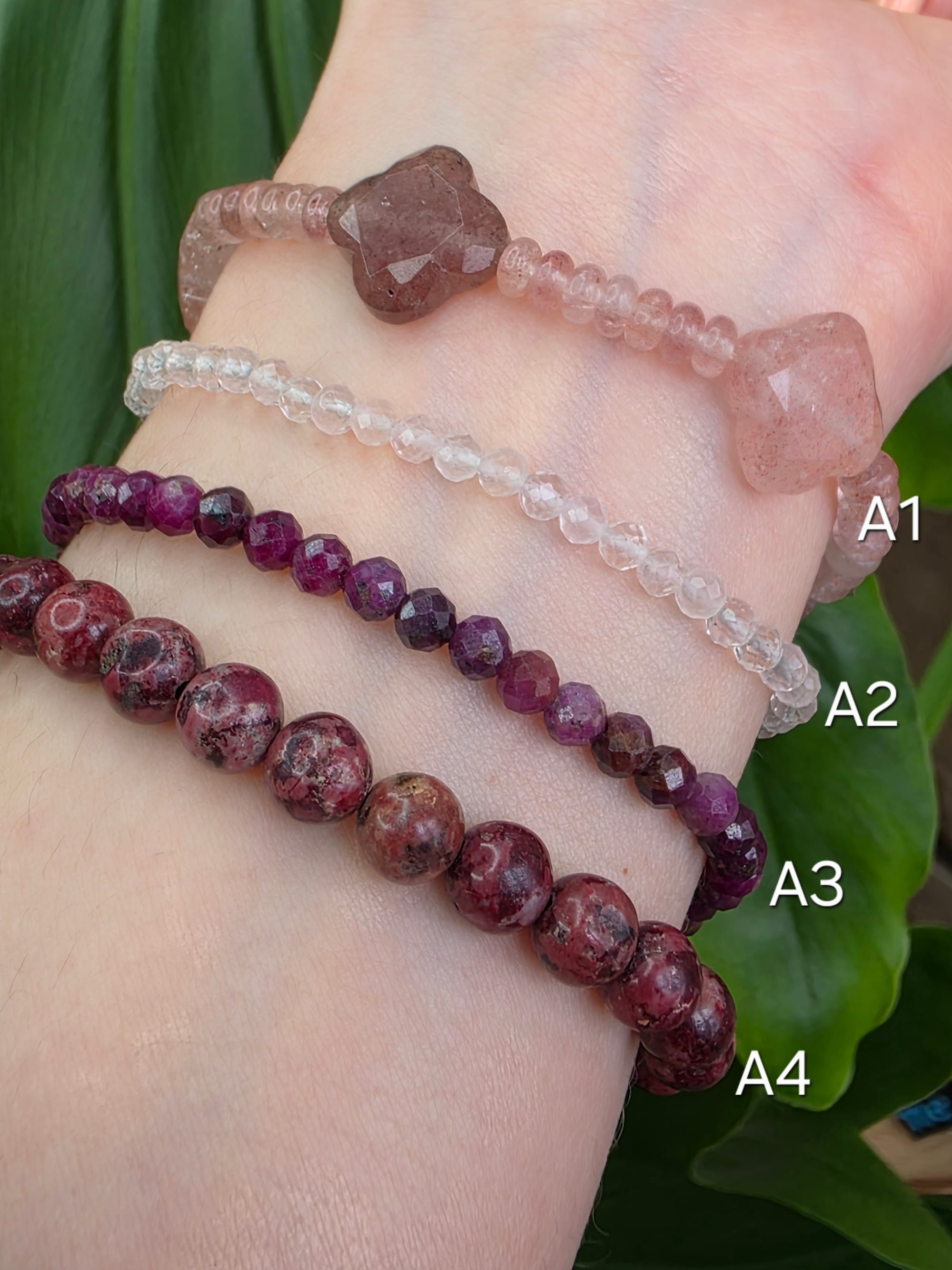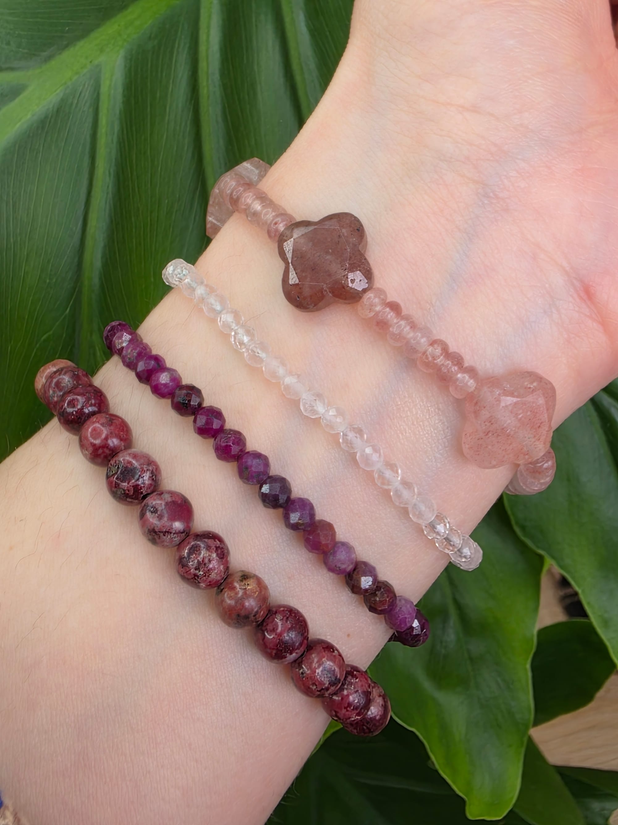 A1 – Strawberry Quartz Quatrefoil (13mm) with tiny rondelles (4x2mm) – $30