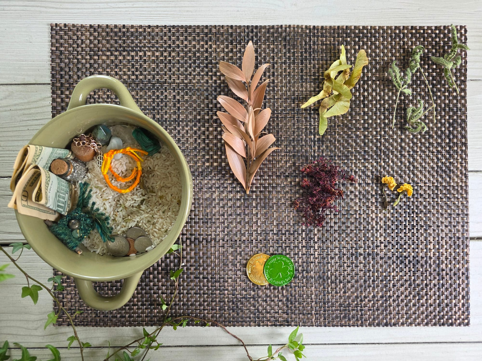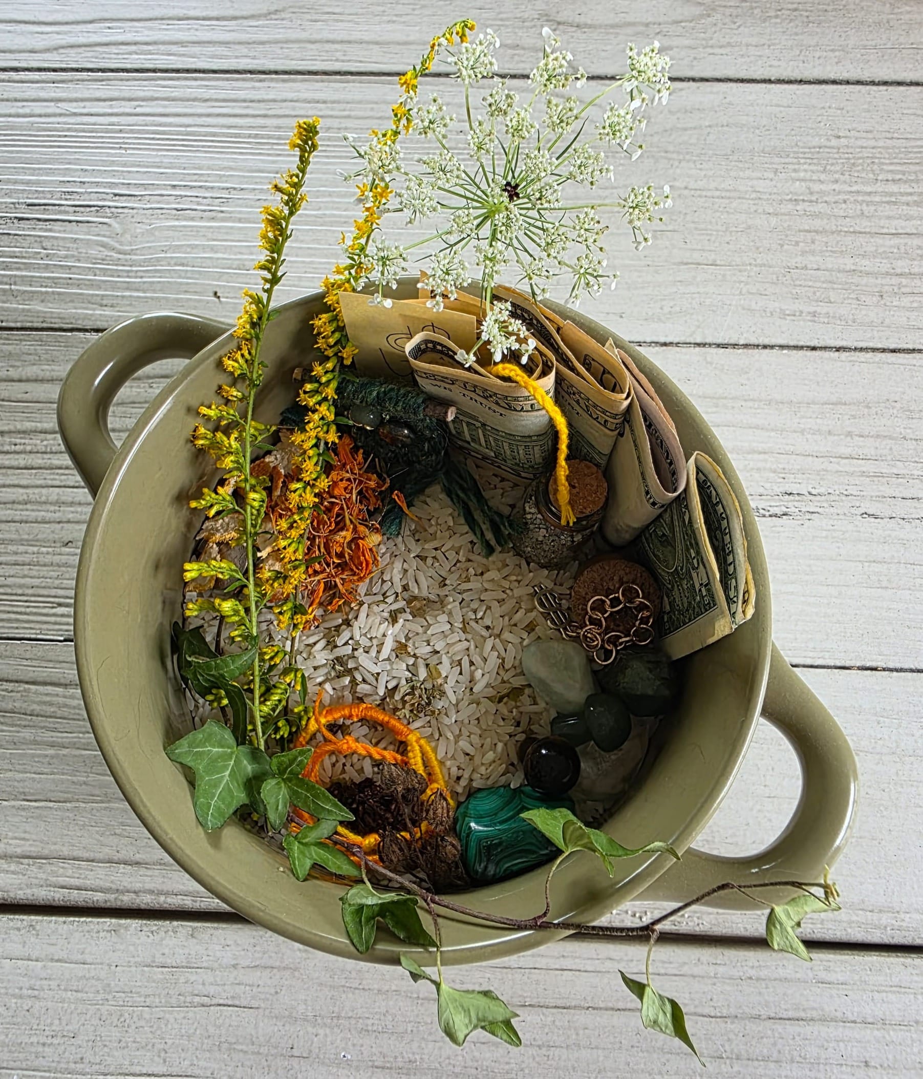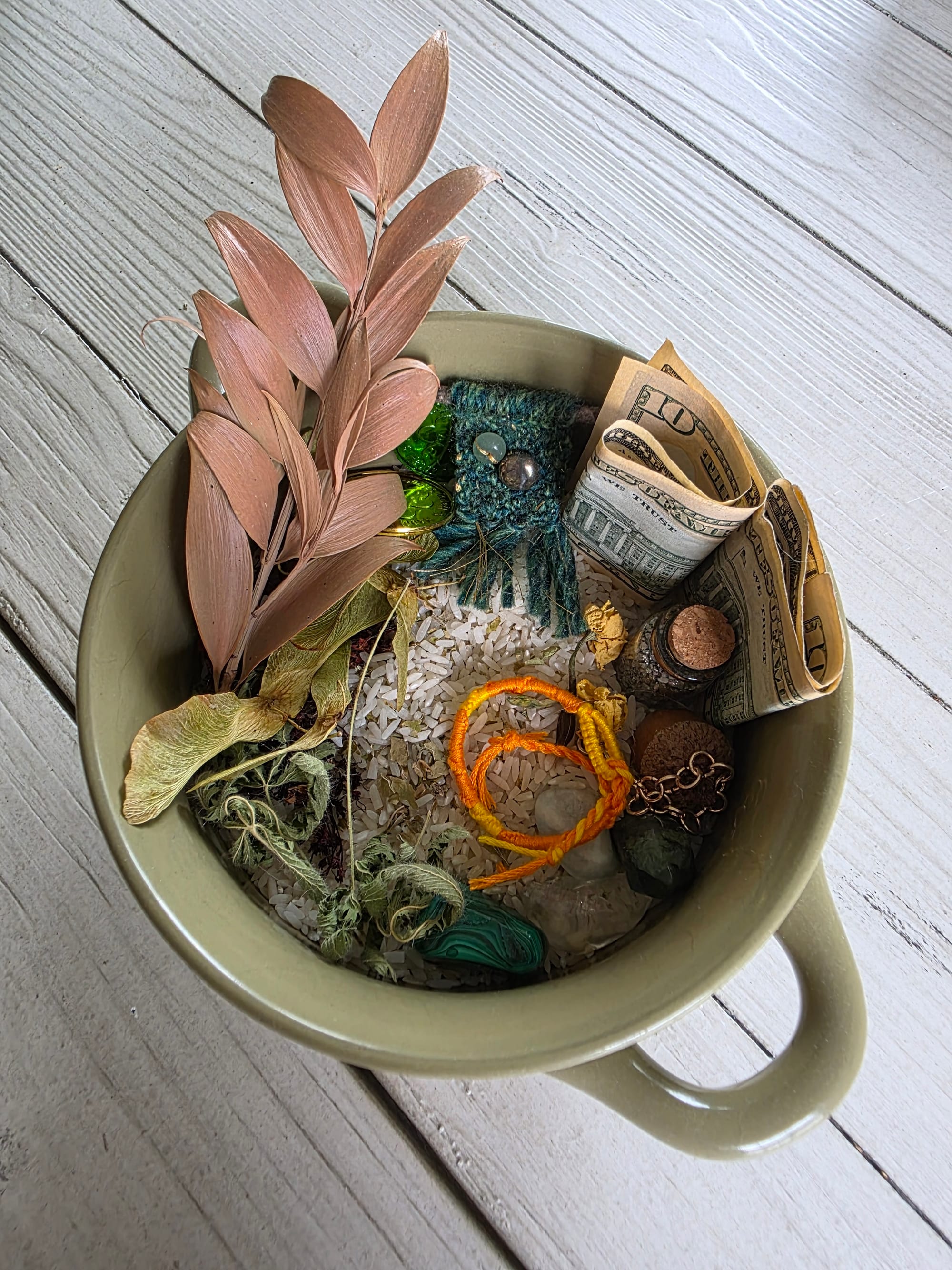 Many things can be used for a money bowl base. I used uncooked rice, but you can also use dried beans, salt, crystal chips, pyrite sand, small coins, etc. I also sprinkled some dried herbs from my garden, probably mint and basil. (I made the money bowl on January 1st so it's been a minute.) Add a few coins and bills to your base and you've got yourself a solid start to your money bowl. As it grows throughout the year, so does your abundance.