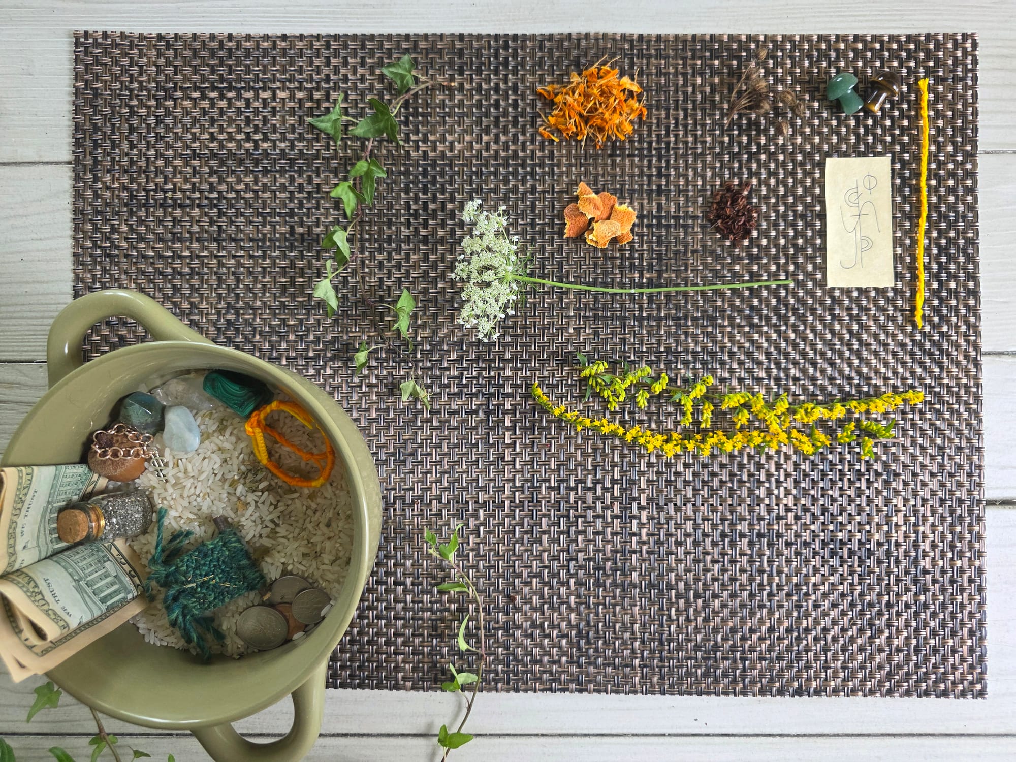 Let's finish with the fresh wildflowers. Queen Anne's lace is not necessarily used to bring in money, but it does help with perserverance and new beginnings and it's currently blooming in my backyard, so it felt like an appropriate addition. (When foraging for Queen Anne's Lace, a form of wild carrot, look for the single blood-red petal in the middle of the flower and a hairy stem. Poison hemlock looks very similar but has blotchy red/purple spots/streaks on a thicker, hairless stem.) The beautiful, bright yellow flowers are from a native variety of goldenrod, and the pollinators just love these plants. It was hard to find an unoccupied stalk. In herbal magick, goldenrod is used for prosperity, positivity, wisdom, love, divination and psychic ability, and luck. After everything was done I also added a couple more bills.